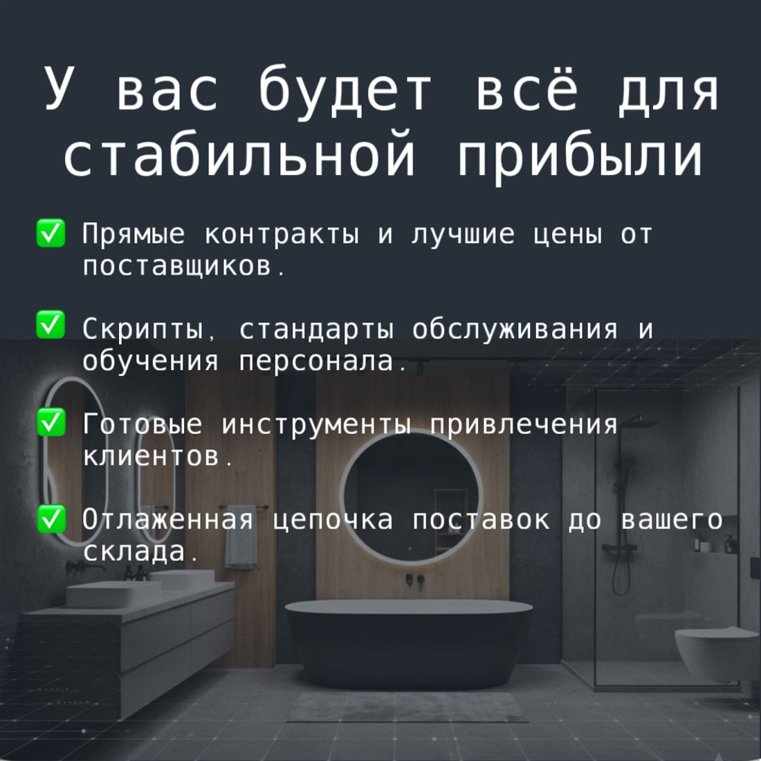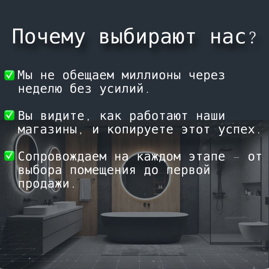 ID в ИМЛС: 11189959 Сантехника ломается, люди делают ремонты и строят дома всегда. Это ниша с постоянным спросом. Мы не продаём «воздух» или красивые теории. Мы предлагаем опыт, наработанный с 2009 года. Мы — это сеть из 5 собственных розничных магазинов. Мы знаем, что продаётся, как работать с клиентом и как выжить среди конкурентов. Почему с нами надёжно: ? Реальный опыт: Работаем 15 лет на рынке. ? Широкий охват: Умеем зарабатывать и на эконом-сегменте (краны, расходники), и на дорогой качественной сантехнике. Вы не теряете ни одного клиента. ? Честный подход: У нас нет «волшебных таблеток». Есть отлаженные бизнес-процессы, которые работают в наших магазинах и будут работать у вас. Что входит во франшизу: Помощь в открытии: Подбор помещения, оценка локации. Поставщики: Передадим базу проверенных поставщиков с нашими скидками. Ассортимент: Поможем сформировать товарную матрицу, чтобы товар не лежал мёртвым грузом. Программное обеспечение: Настроим учёт и научим им пользоваться. Сопровождение: Мы на связи. Возник вопрос — мы подсказали решение. Цифры и условия: ? Паушальный взнос: 500 000 руб. (единоразово за право работать под нашим брендом и поддержку). Инвестиции в открытие: от 700 000 руб. Сумма гибкая! Мы умеем работать с разным бюджетом. Можно начать с небольшого отдела и расширяться, или сразу открыть полноценный шоурум. Подберём формат индивидуально под ваши возможности. Для кого это предложение: Для тех, кто ищет понятный, земной бизнес и готов работать. ? Звоните или пишите в сообщения! Расскажу подробнее о нашей сети, покажу цифры и обсудим, какой формат магазина подойдёт именно вам.